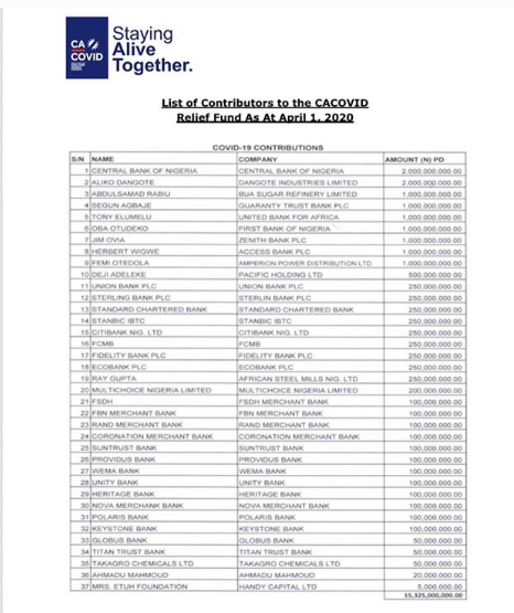 The billionaires all donated sums of N1 billion each except Aliko Dangote and CBN that donated N2 billion each.
