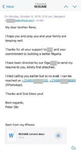 In the post, Omokri shared a screenshot of the alleged email dated October 8, 2018, with the subject “RESUME.”
