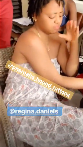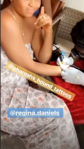 Regina Daniels has been spotted in a video getting a tattoo on her wrist in a tattoo parlour situated in Abuja, Federal Capital Territory.