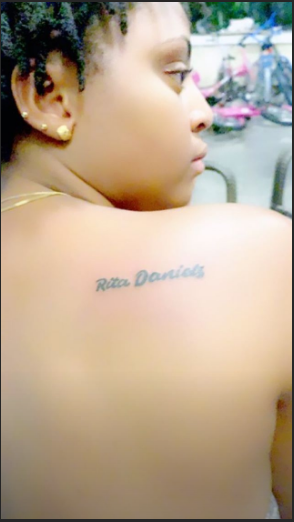 Unknown to many, ‘The Enemy I Know’ singer also got herself a tattoo of her mother’s name ‘Rita Daniels’. She had her mum’s name etched at her back, just a few inches from her right shoulder. It is, however, unsure if she also got the tattoo at the same spot in Abuja or during one of her frequent travels abroad.